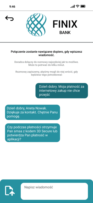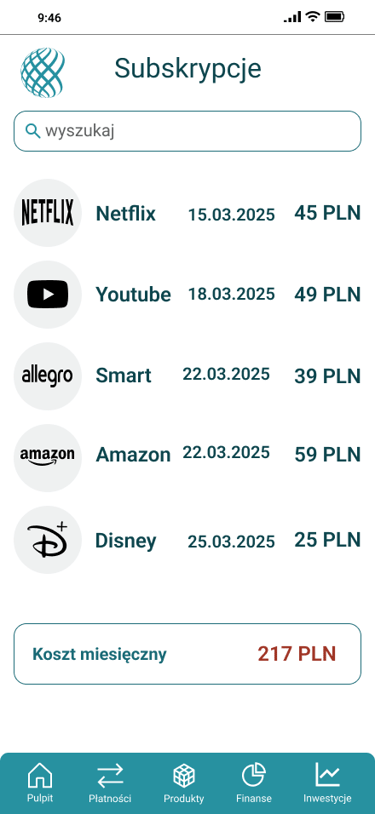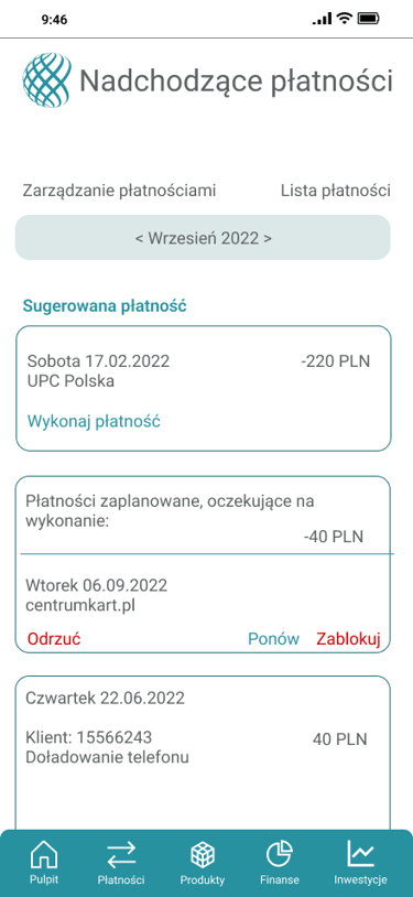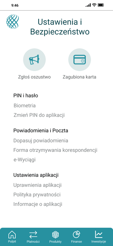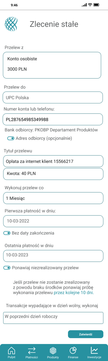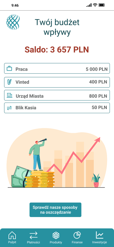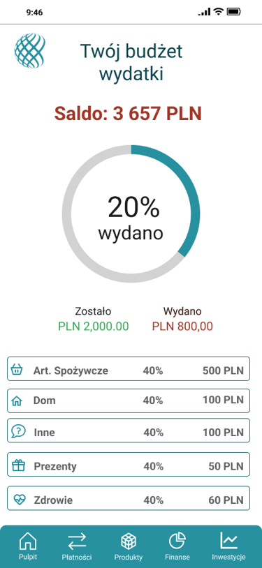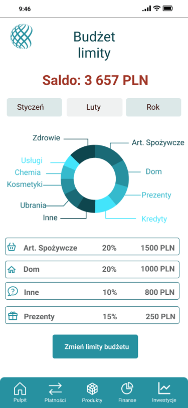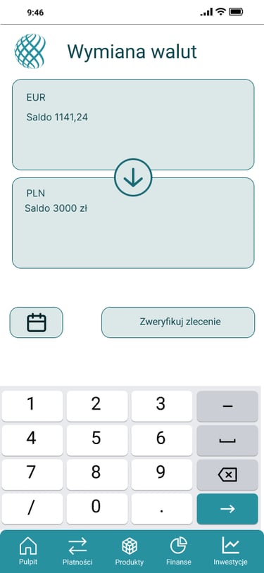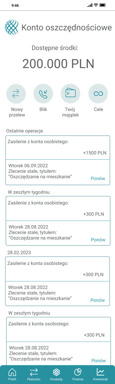 Odwzorowany finalny wygląd i funkcjonalność aplikacji bankowej
